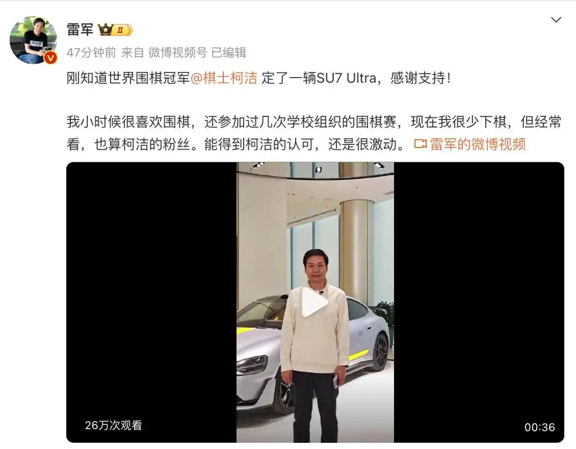 雷軍:剛知道世界圍棋冠軍柯潔定了一