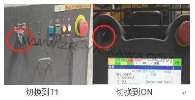 a.機器人手動模式 機柜切換到T1 TP示教器切換到ON
