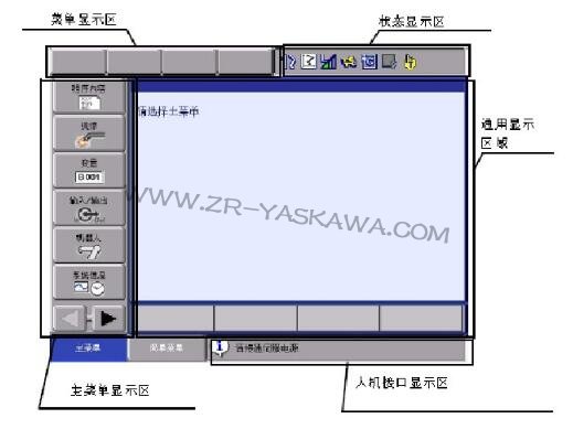 5個顯示區(qū)包括通用顯示區(qū)、狀態(tài)顯示區(qū)、菜單顯示區(qū)、人機(jī)接口顯示區(qū)、和主菜單區(qū)。