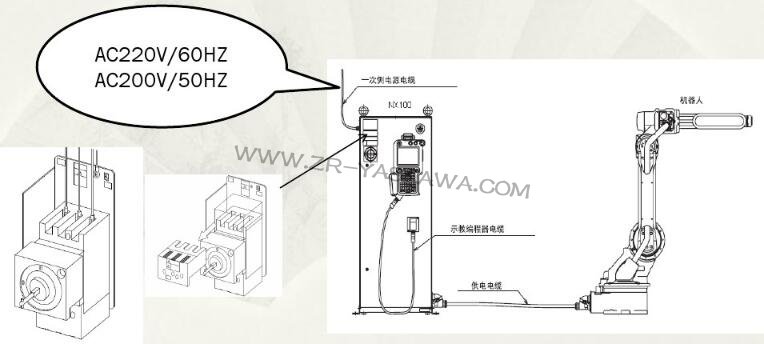 機(jī)器人、供電電纜、一次側(cè)電源電纜和示教編程器電纜的連接圖如下:
