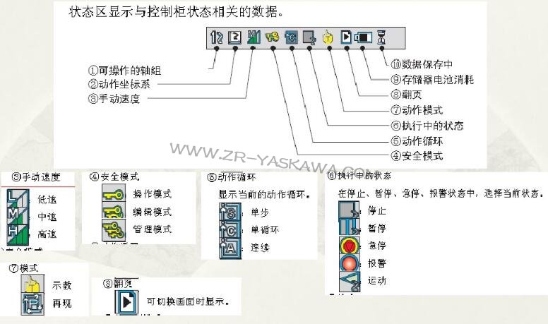 狀態(tài)區(qū)顯示與控制柜狀態(tài)相關(guān)的數(shù)據(jù)。