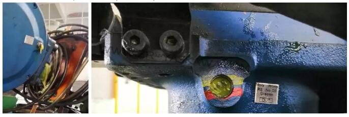 拆除排油口和注油口的油塞,在注脂口處安裝油嘴,出油口處進行廢油收集。利用油槍進行注油,在出脂口觀察出脂狀態,每個軸加完對應定量油脂包即可,按照此流程完成機器人6個軸的注脂和注油工作,并注意廢油和脂的的收集回收。