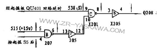 停弧控制如圖8所示。按停弧按鈕S6后,RS觸發(fā)器X207(A、B)翻轉(zhuǎn),X207(B)5↓→Q208截止,焊機(jī)焊接狀態(tài)停止,由于X207(B)5↓→X207(B)6↑→X202(C)10↑、X202(C)9↓→X202(C)8↓→X205(C)6↑,584C、X401(D)13↑→X401(D)11↓→X401(C)8↑→Q401導(dǎo)通,焊機(jī)進(jìn)入給定熄弧規(guī)范狀態(tài)。經(jīng)PUT(QU401)回路延時(shí)后,583C↑→X206(b)4↓一587↓焊絲反抽。