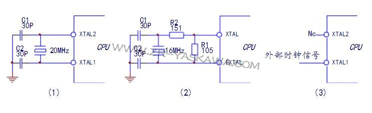 因CPU型號的不同和振蕩元件的差異,CPU外接晶振電路也有所不同。另外極少數變頻器產品,采用雙CPU控制,由專用時鐘信號發生器,直接輸出振蕩信號給CPU,如圖7-3(3)電路。
