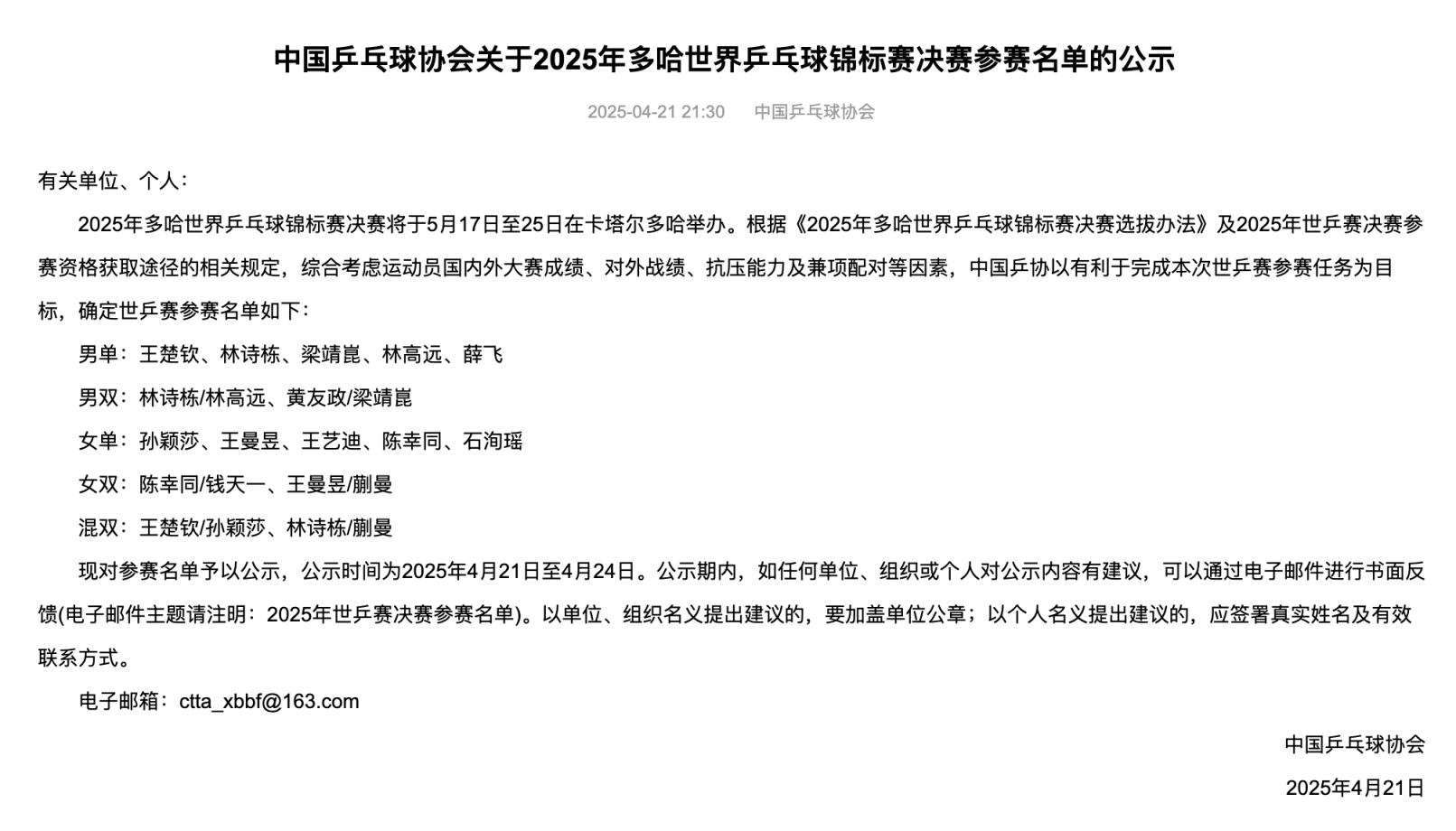 多哈世乒賽:王楚欽孫穎莎再度攜手出