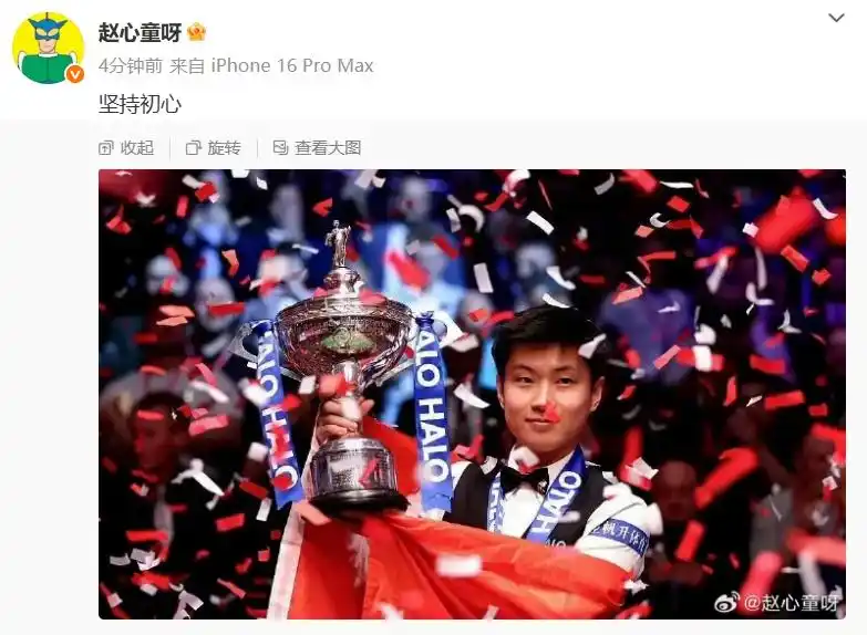 趙心童邀請女朋友上臺 配文寫道:堅(jiān)