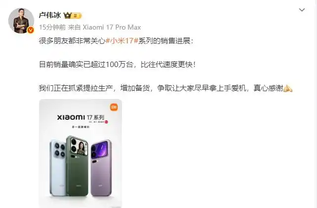 盧偉冰:小米17系列銷量已超100萬臺